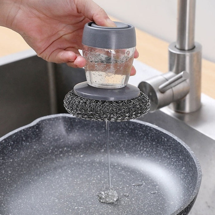 Não procure mais do que a esponja de metal para esfregar panelas com escova dispensadora de sabão líquido e ferramenta de limpeza de botão para uso doméstico! Essa Bucha Inteligente de Louça é resistente à ferrugem remove manchas tenazes, graxa e sujeira que se acumularam ao longo do tempo com facilidade.